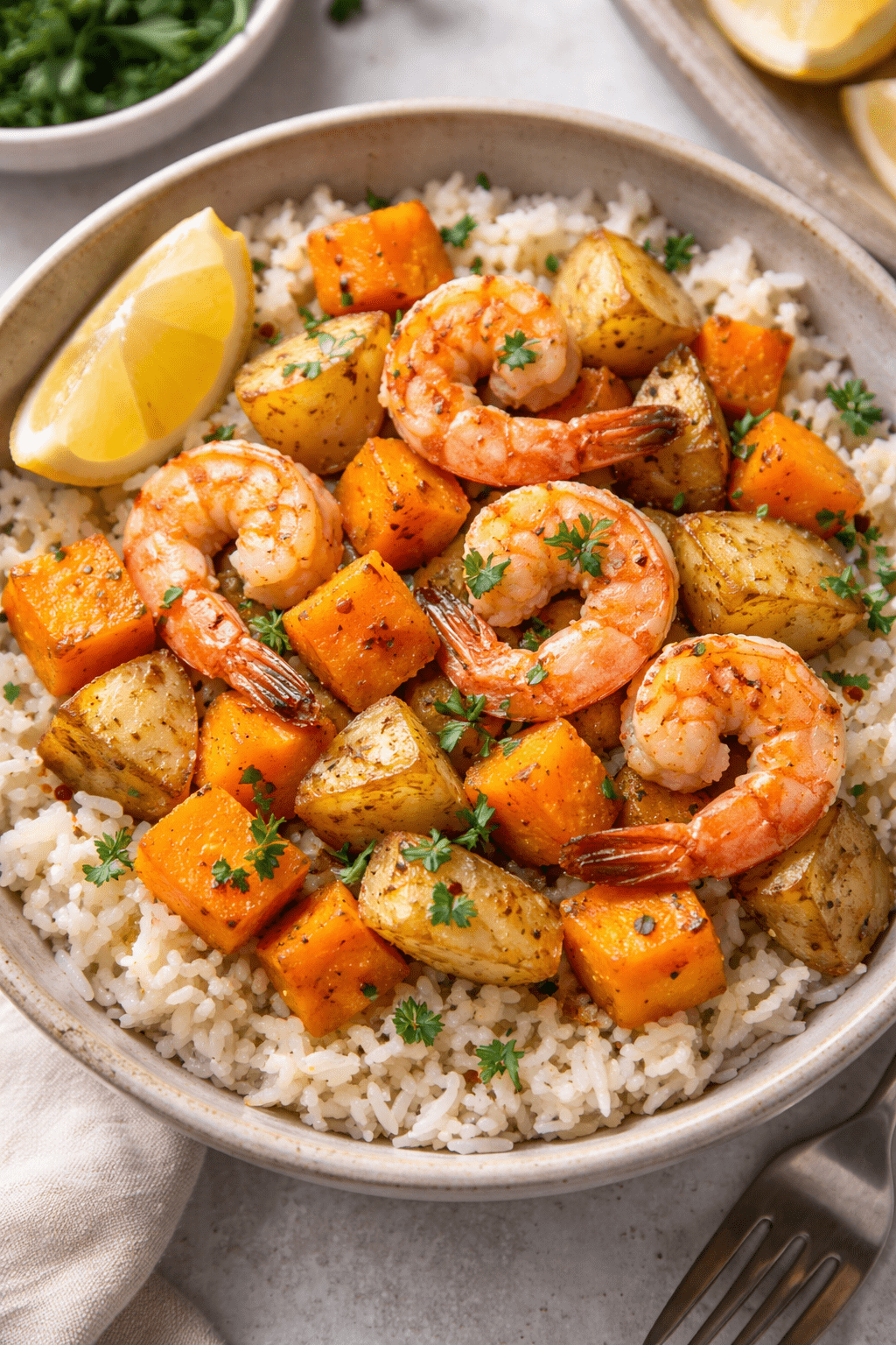 Butternut squash, potatoes & shrimp on rice $30 View Detail |