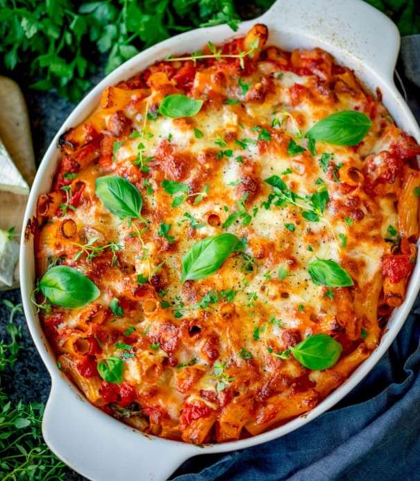 Baked Pasta with Italian sausage, peppers & mushrooms, served with a side Cesar salad