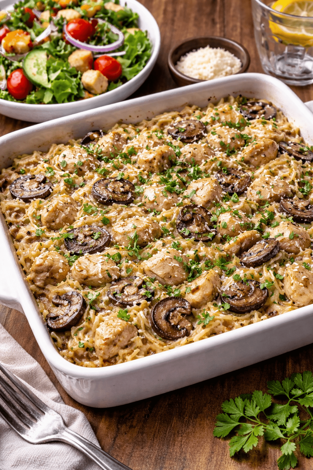 Chicken mushroom orzo casserole with side salad ($25)