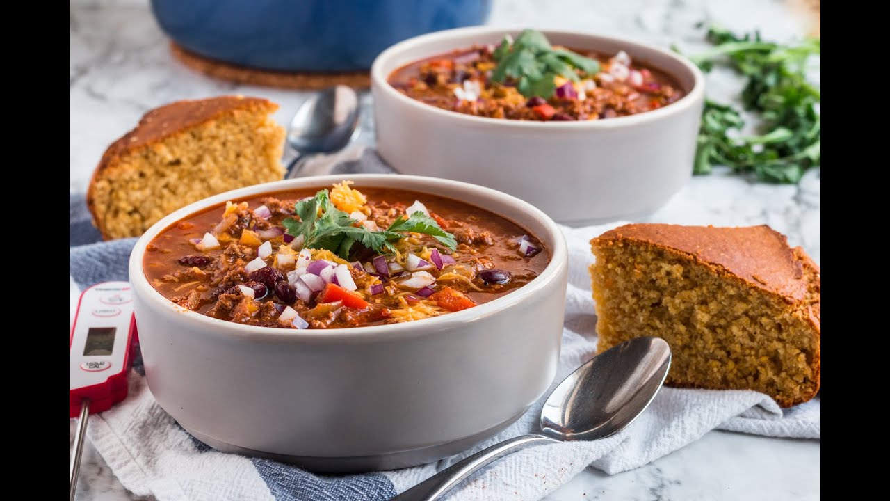 Meat chili, made with ground beef and served with bread.