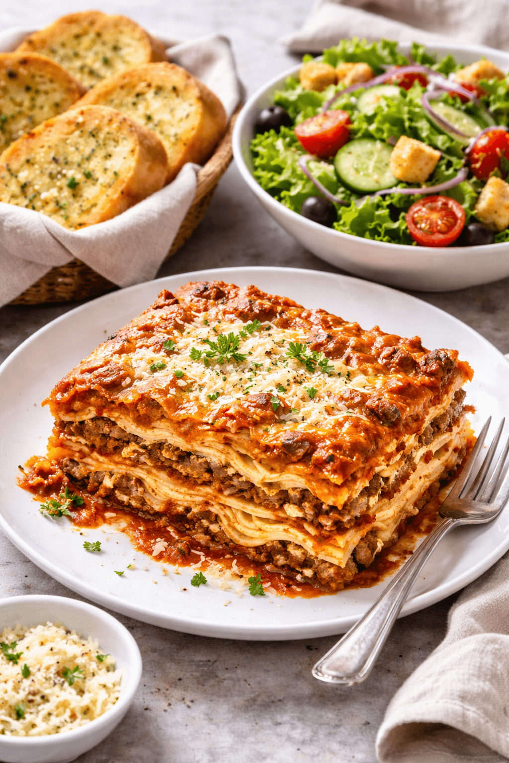 Meat lasagna + Caesar salad + garlic bread